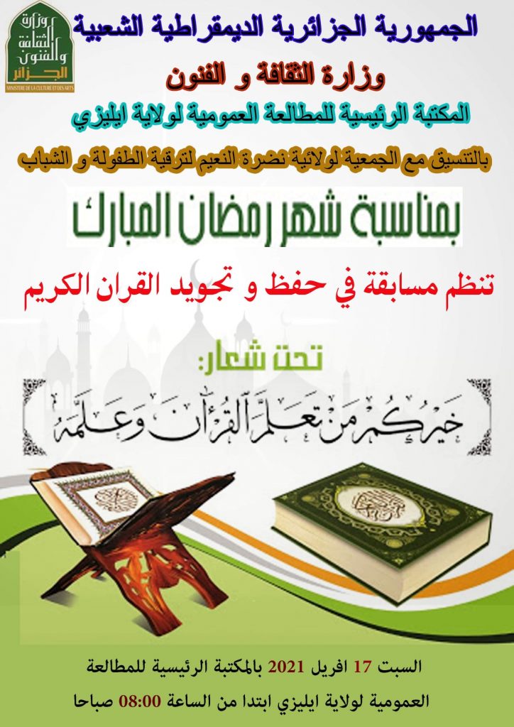 تزامنا والشهر الفضيل شهر القرآن الكريم عكفت المكتبة الرئيسية للمطالعة العمومية على تنظيم عدة مسابقات على غرار مسابقة القرآن الكريم التي لاقت إقبالا منقطع النظير من طلاب المدراس القرآنية بالولاية للمنافسة في هذه المسابقة وذلك أمام لجنة تحكيم متمثلة في مجموعة من الأئمة مرت هذه المسابقة بمجموعة من الأدوار إلى الدور الأخير الذي كرم فيه الفائزين.