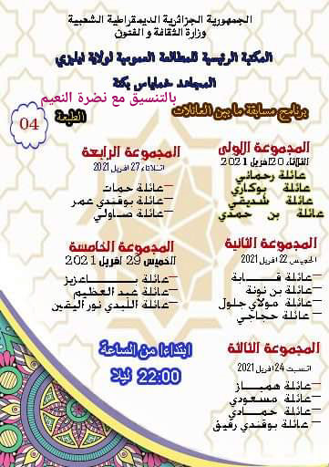 نظمت المكتبة الرئيسية للمطالعة العمومية مسابقة فكرية ثقافية بين العائلات وذلك تزامنا والشهر الكريم تكريسا للفعل الثقافي و توسيعا لأطر المقروئية وتشجيعا للمطالعة وتعزيزها كما كرمت العائلات المتفوقة في هذه المسابقة في حفل ختامي على شرف العائلات تخلل هذه اللقاءات جملة من العروض المسرحية والإبتهالات.