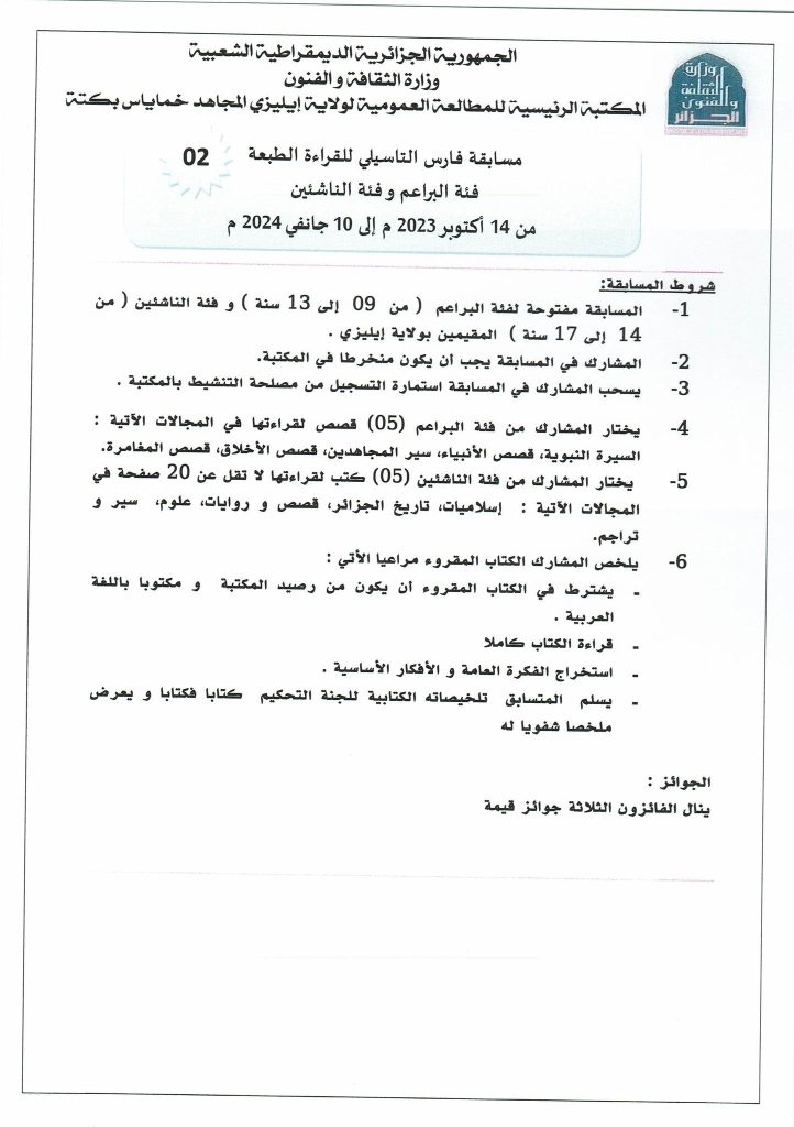 ولايتي “تيزي وزو وإليـزي” تحطان الرحـال بولاية “الطــارف” برعايةٍ كريمةٍ من السيدة وزيـرة الثقافة و الفنون الدكتورة “صُـورية مُولـوجي”، وبإشراف من والي ولاية الطارف، إفتتحَت سهرة أمس الأحد 24 سبتمبر 2023 بالمكتبة الرئيسية للمطالعة العمومية لولاية الطارف، تظاهرة الأسبوع الثقافي لولايتي “تيزي وزو وإليـزي” أين حطا الرحال بأقصى الشرق الجزائري “ولاية الطارف” بحضور القائمين على …
