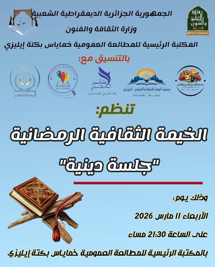مواصلة لفعاليات إحياء لليالي رمضان الفضيل لسنة 2026 تنظم المكتبة الرئيسية للمطالعة العمومية خماياس بكتة إيليزي بالتنسيق مع التكتل الجمعوي.. جلسة دينية من تأطير الاستاذ “عبد الله بن لحسن” وذلك يوم الاربعاء 11 مارس 2026 بعد صلاة التراويح بالمكتبة الرئيسية للمطالعة العمومية خماياس بكتة إيليزي